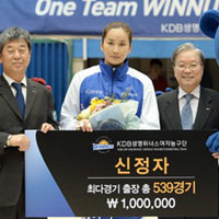 KDB생명, 신정자 500경기 기념시상…늦었지만 의미 깊었다