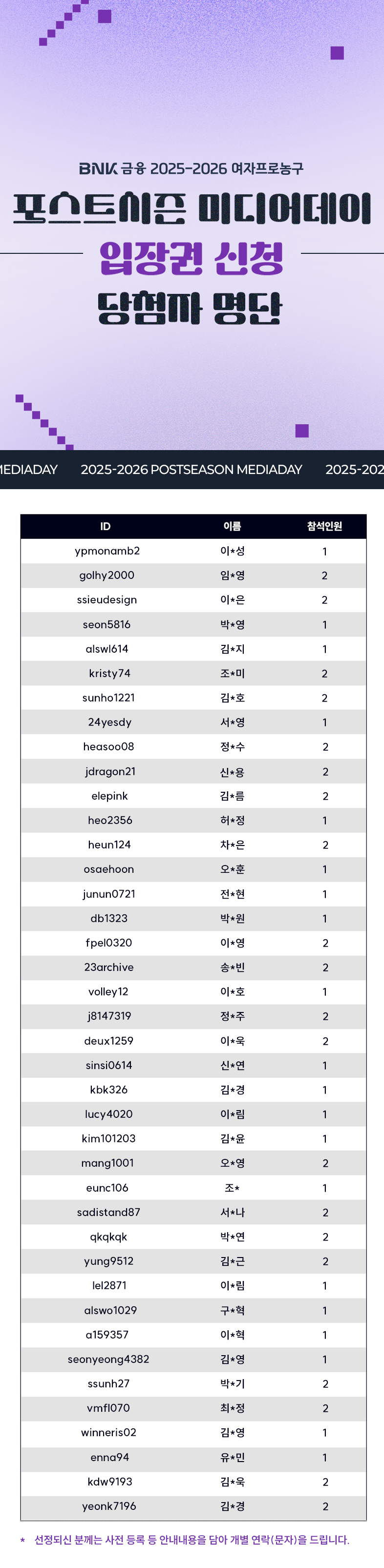 BNK금융 2025~2026 여자프로농구 포스트시즌 미디어데이 입장권 신청 당첨자 명단