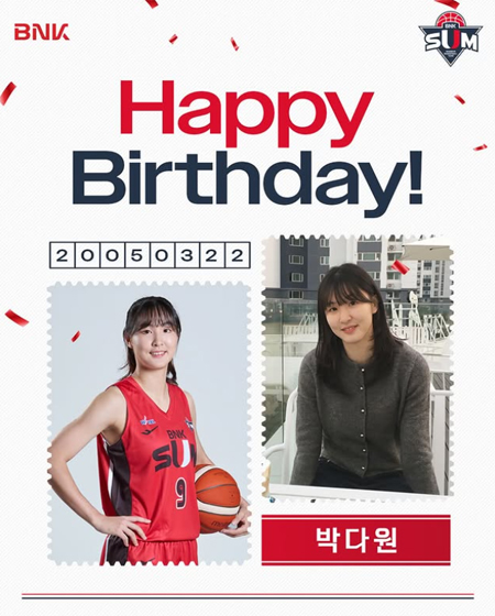 #BNK 썸 오늘은 박다원 선수의 생일입니다 작성일: 2026-03-22 조회: 23 페이스북 공유 트위터 공유 카카오스토리 공유 오늘은 박다원 선수의 생일입니다다원선수의 생일을 축하해 주세요#BNK썸 #BNK썸여자프로농구단 #BNK부산은행 #박다원 [자세히보기]