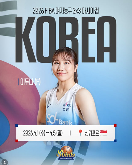 #신한은행 2026 FIBA 여자농구 3x3 아시아컵 국가대표로 발탁 되었습니다 작성일: 2026-03-24 조회: 45 페이스북 공유 트위터 공유 카카오스토리 공유 신한은행 에스버드 이두나 선수가2026 FIBA 여자농구 3x3 아시아컵 국가대표로 발탁 되었습니다이두나 선수가 잘 다녀올 수 있도록버디 여러분의 많은 응원 부탁드립니다2026. 4. 1(수) ~ 4. 5(일)싱가포르#이두나 #3x3국가대표 #신한은행에스버드 [자세히보기]