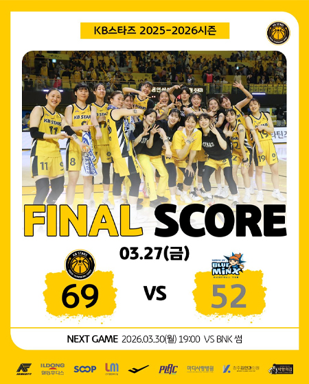 #KB스타즈 3월 27일 [경기 결과] 작성일: 2026-03-27 조회: 57 페이스북 공유 트위터 공유 카카오스토리 공유 KB스타즈 | 3월 27일 [경기 결과]KB스타즈 69-52 삼성생명Photo in Cheongju_2026.03.27#KB스타즈 ㅣ #정규리그 ㅣ #GAMEDAY#2025_2026시즌 #청주 #홈경기 #경기결과#6라운드 #GAME4 #승리 #20승9패#플랙 #프로스펙스 #SOOP#엘앰메디컬 #청주김안과의원#마디사랑병원 #일동후디스#박향희김 #아머핏 [자세히보기]