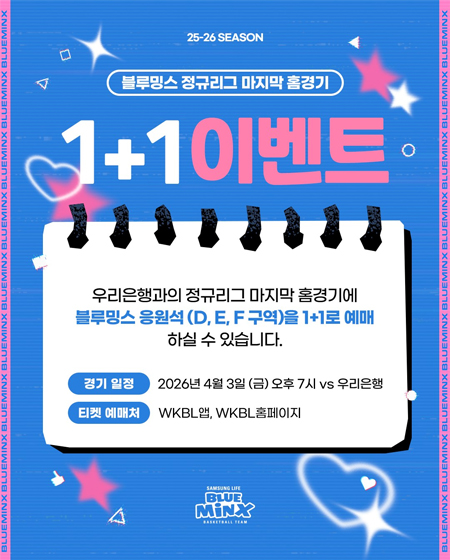 #삼성생명 정규리그 마지막 홈경기 이벤트 작성일: 2026-04-02 조회: 64 페이스북 공유 트위터 공유 카카오스토리 공유 정규리그 마지막 홈경기 이벤트 ?내일 있을 정규리그 마지막 홈경기!블루밍스 응원석을 1+1으로 예매하실 수 있습니다마지막 홈경기 많이 찾아와 주세요 #홈경기이벤트 #정규리그마지막#블밍티비 #블밍캠#삼성생명 #삼성생명블루밍스#프로스펙스 #GOBLUEMINX#WKBL #여자농구? [자세히보기]
