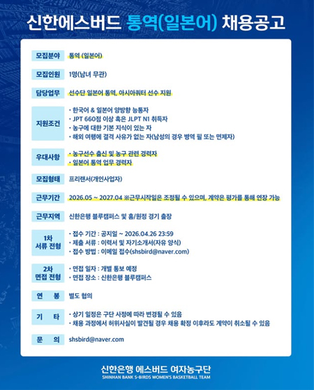 #신한은행에스버드 #여자농구 #WKBL #채용공고 #일본어통역