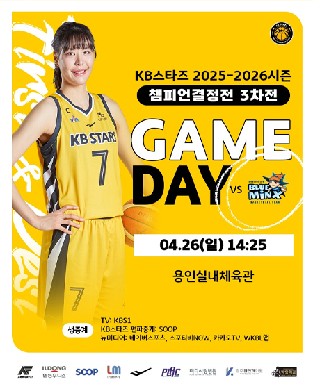 #KB스타즈 「챔피언결정전 3차전」 GAME DAY 작성일: 2026-04-26 조회: 91 페이스북 공유 트위터 공유 카카오스토리 공유 KB스타즈 |「챔피언결정전 3차전」 GAME DAY?2026년 4월 26일(일) 14:25KB스타즈 vs 삼성생명경기 장소: 용인실내체육관TV 생중계: KBS1KB스타즈 편파중계: SOOP뉴미디어 생중계: 네이버스포츠, 스포티비NOW, 카카오TV, WKBL앱#KB스타즈 ㅣ #챔피언결정전 ㅣ #GAMEDAY#2025_2026시즌 #finals #챔피언결정전3차전#용인 #원정경기 #KB스타즈편파중계 #SOOP #KBS1#플랙 #프로스펙스#엘앰메디컬 #청주김안과의원#마디사랑병원 #일동후디스#박향희김 #아머핏#청주KB스타즈 #KB스타즈농구단#KBSTARS #KBスタ?ズ #First_and_Best#WKBL #여자농구 #여농#유튜브채널 #국민농구방송? [자세히보기]