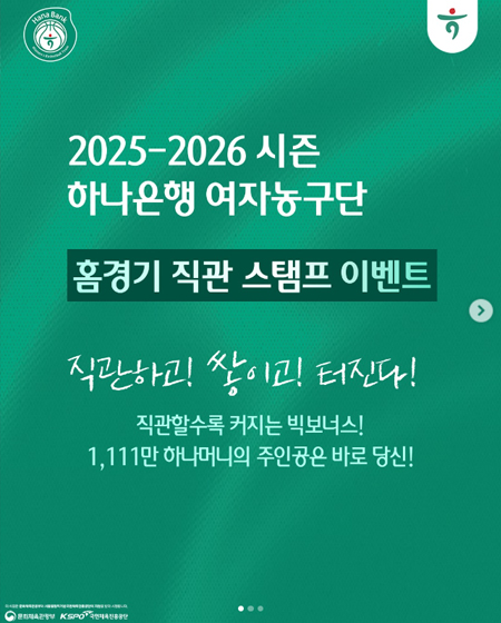 #하나은행2025-2026시즌 하나은행 여자농구단 직관 스탬프 이벤트 작성일 2025-11-12 조회 60 공유하기 페이스북 공유 트위터 공유 카카오스토리 공유 2025-2026시즌 하나은행 여자농구단 직관 스탬프 이벤트경기 볼수록 쌓이는 혜택과 BIG 보너스!최대 하나머니 300만원까지홈경기 출석 스탬프 찍고 경품까지 가져가세요!참여 방법은 이미지를 참고해주세요!#하나은행여자농구단 #하나은행 #하나금융그룹#농구 #여자농구 #여농 #WKBL #홈경기 #직관스탬프 [자세히보기]