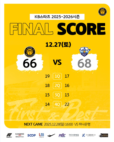 #KB스타즈 12월 27일 [경기 결과] 작성일: 2025-12-27 조회: 165 페이스북 공유 트위터 공유 카카오스토리 공유 KB스타즈 | 12월 27일 [경기 결과]KB스타즈 66-68 우리은행#KB스타즈 ㅣ #정규리그 ㅣ #GAMEDAY#2025_2026시즌 #청주 #홈경기 #경기결과#3라운드 #GAME2 #7승5패#플랙 #프로스펙스 #SOOP#엘앰메디컬 #청주김안과의원#마디사랑병원 #일동후디스#박향희김 #아머핏 [자세히보기]