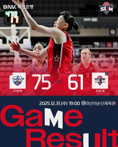 #BNK 썸 2025.12.31.(수) 우리은행과의 경기 결과입니다 작성일: 2025-12-31 조회: 399 페이스북 공유 트위터 공유 카카오스토리 공유 2025.12.31.(수) 우리은행과의 경기 결과입니다#BNK썸 #BNK썸여자프로농구단 #BNK부산은행 [자세히보기]