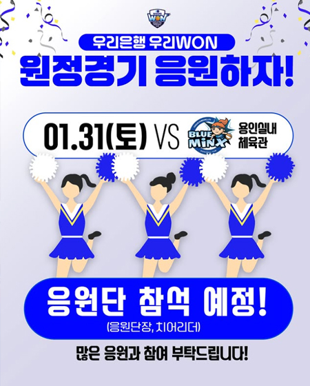 #우리은행 원정도 함께 응원해요 작성일: 2026-01-27 조회: 230 페이스북 공유 트위터 공유 카카오스토리 공유 원정도 함께 응원해요4라운드 마지막 경기를 원정에서 마치는 우뱅이들!승리로 마무리할 수 있게응원단과 함께 파란 물결을 만들어 주세요우리은행 원정 경기26.1.31(토)16:00vs 삼성생명용인실내체육관#우리은행우리WON #원정응원 #우뱅이네 #여자농구 [자세히보기]