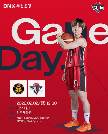 #BNK 썸 GAME DAY 작성일: 2026-02-02 조회: 43 페이스북 공유 트위터 공유 카카오스토리 공유 2025-2026시즌 BNK 썸GAME DAY일시 : 2026년 2월 2일(월) 19:00장소 : 청주체육관VS KB스타즈중계 : KBSN Sports, MBC Sports+ ,SPOTV, ENA Sports#BNK썸 #BNK썸여자프로농구단 #BNK부산은행 [자세히보기]