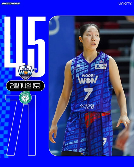 #우리은행 GAME RESULT 작성일: 2026-02-14 조회: 188 페이스북 공유 트위터 공유 카카오스토리 공유 GAME RESULT? 2026.2.14(토) 14시우리은행 45 - 71 하나은행주요선수이민지 - 10득점 6리바운드김단비 - 8득점 6리바운드이다연 - 6득점 7리바운드변하정 - 6득점(3점 2개) 3리바운드우리은행 다음 경기26.2.15(일)16:00vs 삼성생명아산이순신체육관#우리은행 #우리은행우리WON #WKBL#UNICITY #스케쳐스#경기결과 [자세히보기]