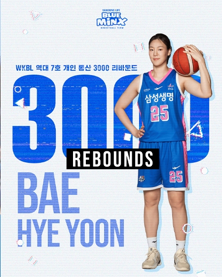 #삼성생명 배혜윤 개인 통산 3000 리바운드 작성일: 2026-02-18 조회: 156 페이스북 공유 트위터 공유 카카오스토리 공유 배혜윤 개인 통산 3000 리바운드WKBL 역대 7호로 개인 통산 3000 리바운드를 달성했습니다 우리의 캡틴 배혜윤WKBL 역사에 7명 밖에 없는 3000 리바운드 달성대기록을 쓴 배캡에게 축하를 보내주세요:) #블밍기록 #배혜윤 #3000리바운드#블밍티비 #블밍캠#삼성생명 #삼성생명블루밍스#프로스펙스 #GOBLUEMINX#WKBL #여자농구? [자세히보기]