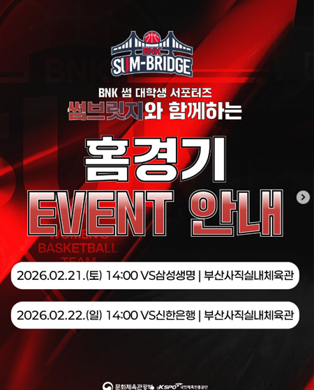 #BNK 썸 대학생 서포터즈 SUM BRIDGE와 함께하는 홈경기 이벤트 작성일: 2026-02-21 조회: 103 페이스북 공유 트위터 공유 카카오스토리 공유 BNK썸 대학생 서포터즈SUM BRIDGE와 함께하는 홈경기 이벤트경기일시 2026년 2월 21일 (토) 14:00경기일시 2026년 2월 22일 (일) 14:00*자세한 사항은 이미지를 참고해주세요.*대학생 서포터즈 썸 브릿지는 선수들과 팬을 하나로 이어준다는 의미를 가지고 있습니다. [자세히보기]