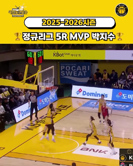 #KB스타즈 MVP 박지수, 5R 명장면 작성일: 2026-02-23 조회: 164 페이스북 공유 트위터 공유 카카오스토리 공유 KB스타즈 | MVP 박지수, 5R 명장면? 2025-2026시즌 여자프로농구 flex 정규리그 5라운드 ’MVP‘ 박지수 #박지수 ㅣ #KB스타즈 ㅣ #국민농구방송 #2025_2026시즌 #라운드MVP [자세히보기]
