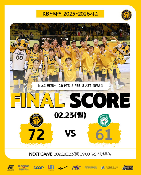 #KB스타즈 2월 23일 [경기 결과] 작성일: 2026-02-23 조회: 178 페이스북 공유 트위터 공유 카카오스토리 공유 KB스타즈 | 2월 23일 [경기 결과]KB스타즈 72-61 하나은행Photo in Cheongju_2026.02.23#KB스타즈 ㅣ #정규리그 ㅣ #GAMEDAY#2025_2026시즌 #청주 #홈경기 #경기결과#6라운드 #GAME2 #승리 #19승8패#플랙 #프로스펙스 #SOOP#엘앰메디컬 #청주김안과의원#마디사랑병원 #일동후디스#박향희김 #아머핏 [자세히보기]