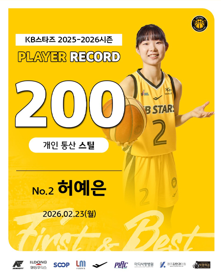 #KB스타즈 허예은, 개인통산 '스틸 200개' 달성 작성일: 2026-02-23 조회: 178 페이스북 공유 트위터 공유 카카오스토리 공유 KB스타즈 | 허예은, 개인통산 '스틸 200개' 달성No.2 허예은WKBL 통산 57번째 기록100 스틸 【2024.01.14】 113G200 스틸 【2026.02.23】 182G기록 달성일_in Cheongju_2026.02.23#KB스타즈 ㅣ #No2 ㅣ #허예은 ㅣ #200스틸#2025_2026시즌 #정규리그 #허예은선수 #개인기록#허예은스틸 #스틸 #200개 #기록달성#스틸200개 #200Steals #스틸기록 #WKBL통산 #57번째 #축하합니다 [자세히보기]
