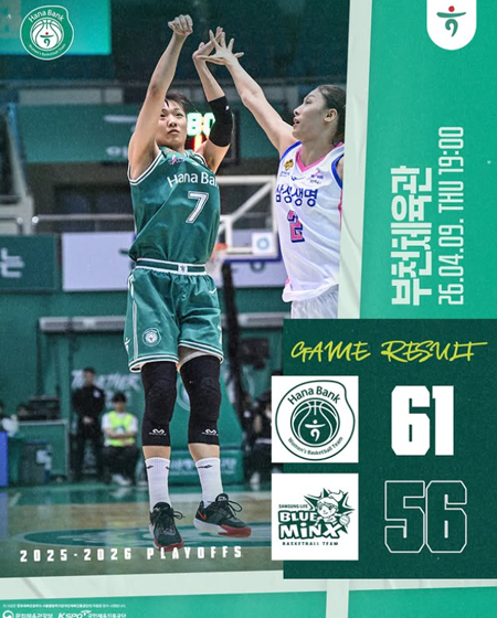 #하나은행 MATCH RESULT 작성일: 2026-04-09 조회: 202 페이스북 공유 트위터 공유 카카오스토리 공유 2025-2026시즌 플레이오프 하나은행 여자농구단MATCH RESULT하나은행 61-56 삼성생명#하나은행여자농구단 #하나은행 #하나금융그룹#농구 #여자농구 [자세히보기]