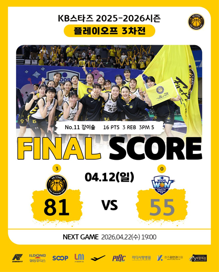 #KB스타즈 플레이오프 3차전 [경기 결과] 작성일: 2026-04-12 조회: 152 페이스북 공유 트위터 공유 카카오스토리 공유 KB스타즈 | 플레이오프 3차전 [경기 결과]KB스타즈 81-55 우리은행[챔피언결정전 진출]Photo in Asan_2026.04.12#KB스타즈 ㅣ #플레이오프 ㅣ #GAMEDAY#2025_2026시즌 #playoffs #플레이오프3차전#경기결과 #승리 #챔피언결정전 #finals #진출#플랙 #프로스펙스 #SOOP#엘앰메디컬 #청주김안과의원#마디사랑병원 #일동후디스#박향희김 #아머핏 [자세히보기]