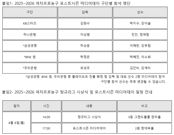 ”2025~2026 여자프로농구 정규리그 시상식 및 포스트시즌 미디어데이 4월 6일 개최“