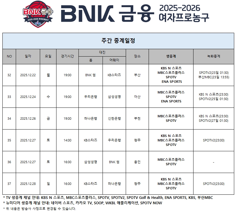 2025년 12월 넷째주 중계일정