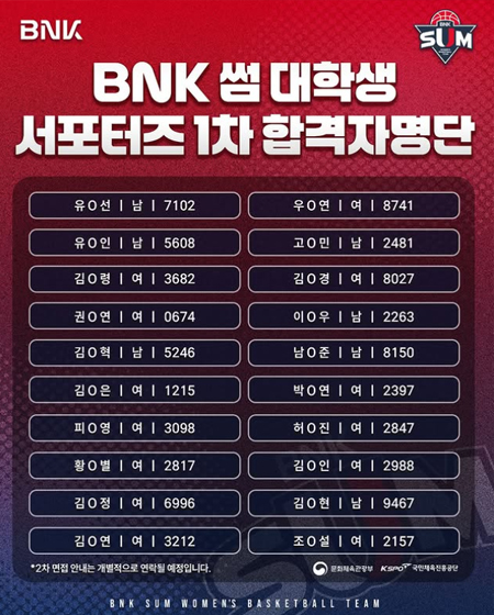 #BNK 썸[BNK 썸 대학생 서포터즈 1기, 1차 합격자 명단] 작성일 2025-10-31 조회 54 공유하기 페이스북 공유 트위터 공유 카카오스토리 공유 [BNK 썸 대학생 서포터즈 1기, 1차 합격자 명단] 농구와 스포츠 마케팅에 관심 있는 부산·경남 대학생들의 많은 관심과 지원속에 1차 합격자 발표 명단 공지합니다 2차 면접 관련 안내는 당첨자들에게 개별 안내가 될 예정입니다BNK 썸 대학생 서포터즈에 지원해주신 모든 지원자분들께 감사드립니다#BNK썸 #BNK썸여자프로농구단 #BNK부산은행 #서포터즈 [자세히보기]