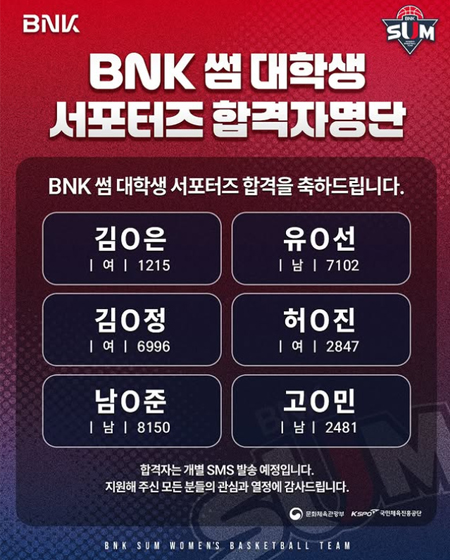 #BNK 썸대학생 서포터즈 1기 합격자 명단을 다음과 같이 공고합니다. 작성일 2025-11-07 조회 35 공유하기 페이스북 공유 트위터 공유 카카오스토리 공유 BNK썸 여자프로농구단대학생 서포터즈 1기 합격자 명단을 다음과 같이 공고합니다.지원해주신 많은 신청자분들에게 감사드리며,합격하신 분들은 개별 연락드릴 예정입니다.#BNK썸 #BNK부산은행 #대학생서포터즈 #여자프로농구 [자세히보기]