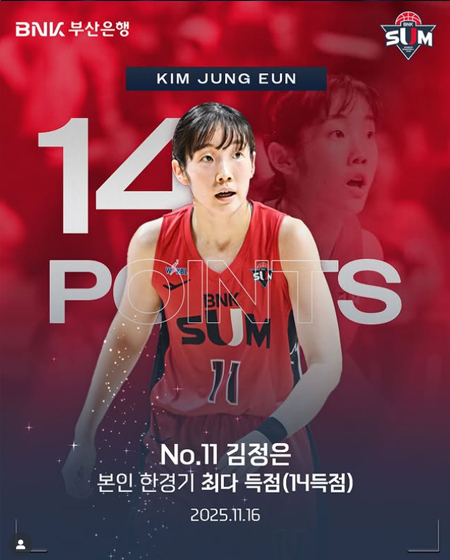 #BNK 썸SUM레코드 작성일 2025-11-16 조회 49 공유하기 페이스북 공유 트위터 공유 카카오스토리 공유 SUM레코드우리의 자랑스러운 니모, 김정은 선수가본인 한경기 최다 득점(14득점)을 달성했습니다!#BNK썸 #BNK썸여자프로농구단 #BNK부산은행 #김정은 [자세히보기]