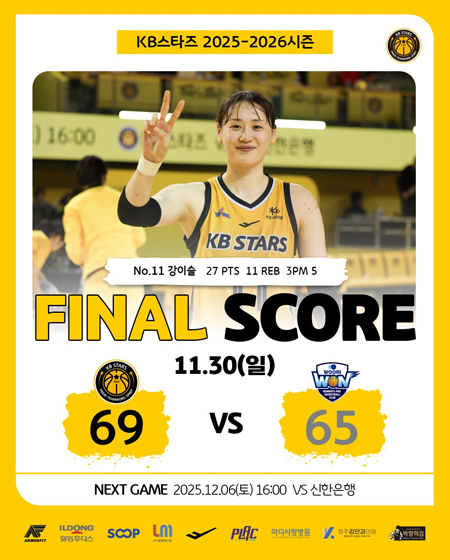 #KB스타즈11월 30일 [경기 결과] 작성일 2025-11-30 조회 70 공유하기 페이스북 공유 트위터 공유 카카오스토리 공유 KB스타즈 | 11월 30일 [경기 결과]KB스타즈 69-65 우리은행#KB스타즈 ㅣ #정규리그 ㅣ #GAMEDAY#2025_2026시즌 #1라운드 #GAME5 #경기결과#청주 #홈경기 #승리 #4승1패#플랙 #프로스펙스 #SOOP#엘앰메디컬 #청주김안과의원#마디사랑병원 #일동후디스#박향희김 #아머핏 [자세히보기]