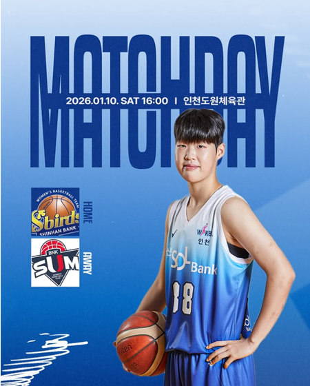 #신한은행MATCH DAY 작성일 2026-01-10 조회 115 공유하기 페이스북 공유 트위터 공유 카카오스토리 공유 MATCH DAY26.01.10 (토) 16:00vs 부산 BNK 썸인천 도원체육관#신한은행에스버드#wkbl #여자농구 [자세히보기]