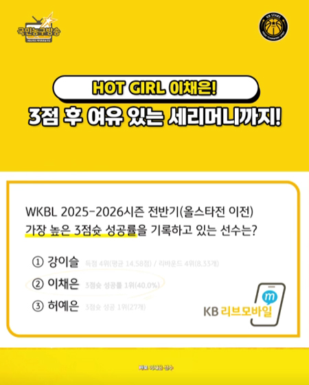 #KB스타즈핫 걸! 이채은의 멋진 세리머니!! 작성일 2026-01-12 조회 95 공유하기 페이스북 공유 트위터 공유 카카오스토리 공유 KB스타즈 | 핫 걸! 이채은의 멋진 세리머니!! [KB스타즈 편파중계] 올 시즌 가장 핫하다! 이채은의 3점 그리고 세리머니! 경기일: 2026년 1월 11일(일) 중계진: 김영현, 홍아란, 원석연 #KB스타즈편파중계 ㅣ #KB스타즈 ㅣ #국민농구방송 ㅣ #shorts #KB스타즈농구단 [자세히보기]