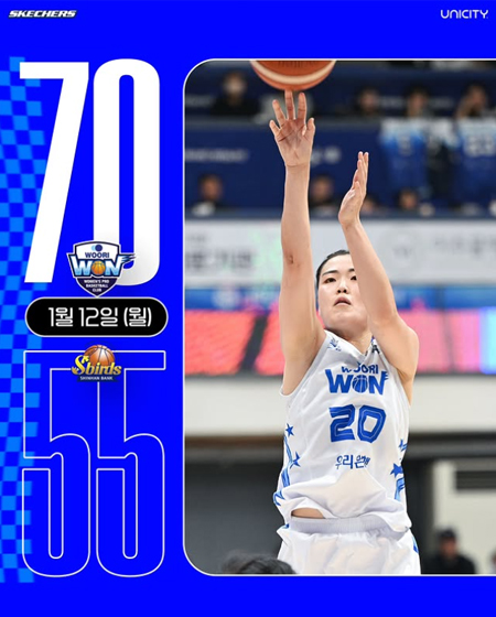 #우리은행GAME RESULT 작성일 2026-01-12 조회 132 공유하기 페이스북 공유 트위터 공유 카카오스토리 공유 GAME RESULT?2025.1.12(월) 19시우리은행 70 - 55 신한은행주요선수이민지 - 16득점 5리바운드 2스틸이명관 - 14득점 2리바운드 2어시스트오니즈카 아야노 - 13득점 3스틸김단비 - 12득점 14리바운드 8어시스트심성영 - 7득점 1리바운드 3어시스트 2스틸우리은행 다음 경기25.1.17(토)16:00vs 하나은행아산이순신체육관#우리은행우리WON #WKBL #UNICITY #스케쳐스 #경기결과 [자세히보기]