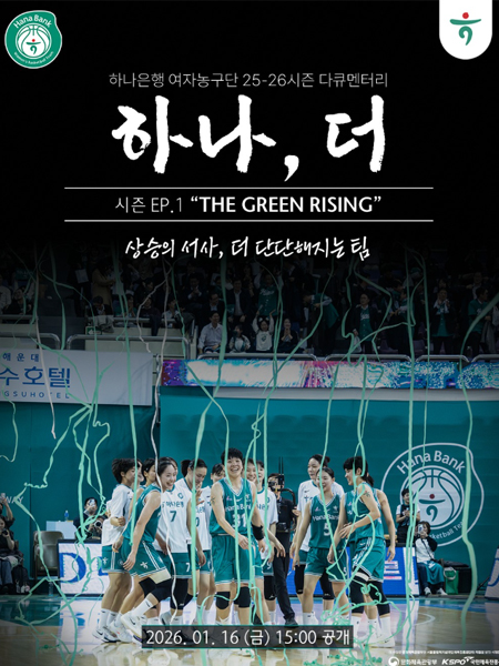 #하나은행시즌 EP 1."THE GREEN RISING" 작성일 2026-01-16 조회 139 공유하기 페이스북 공유 트위터 공유 카카오스토리 공유 [25-26시즌 다큐멘터리 l 하나,더]시즌 EP 1."THE GREEN RISING"상승의 서사, 더 단단해지는 팀 26.01.16(금) 15:00 공개영상은 '하나 TV [하나은행 여자농구단]' 유튜브 채널에서 확인하세요!#하나은행여자농구단 #하나은행 #하나금융그룹 #여자농구 #다큐멘터리 [자세히보기]
