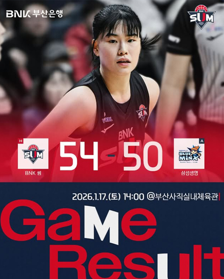 #BNK 썸2026.1.17.(토) 삼성생명과의 경기 결과입니다 작성일 2026-01-17 조회 177 공유하기 페이스북 공유 트위터 공유 카카오스토리 공유 2026.1.17.(토) 삼성생명과의 경기 결과입니다주말 2연전 첫날, 기분 좋은 승리로 시작합니다!많은 응원과 성원에 진심으로 감사드립니다#BNK썸 #BNK썸여자프로농구단 #BNK부산은행 [자세히보기]