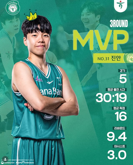 #하나은행2025-2026시즌 WKBL 3라운드 MVP 진안 작성일 2026-01-19 조회 285 공유하기 페이스북 공유 트위터 공유 카카오스토리 공유 2025-2026시즌 WKBL 3라운드 MVP진안 코트 위 넘치는 투지로라운드 내내 골밑을 지배했던 진안5경기 평균 30:19분 출전평균 득점 | 16.0점평균 리바운드 | 9.4개평균 어시스트 | 3.0개#하나은행여자농구단 #하나은행 #하나금융그룹 #여자농구 #여농 [자세히보기]