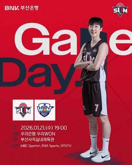 #BNK 썸GAME DAY 작성일 2026-01-21 조회 208 공유하기 페이스북 공유 트위터 공유 카카오스토리 공유 2025-2026시즌 BNK 썸GAME DAY일시 : 2026년 1월 21일(수) 19:00장소 : 부산사직실내체육관VS 우리은행 우리WON중계 : MBC Sports+, ENA Sports, SPOTV#BNK썸 #BNK썸여자프로농구단 #BNK부산은행 [자세히보기]