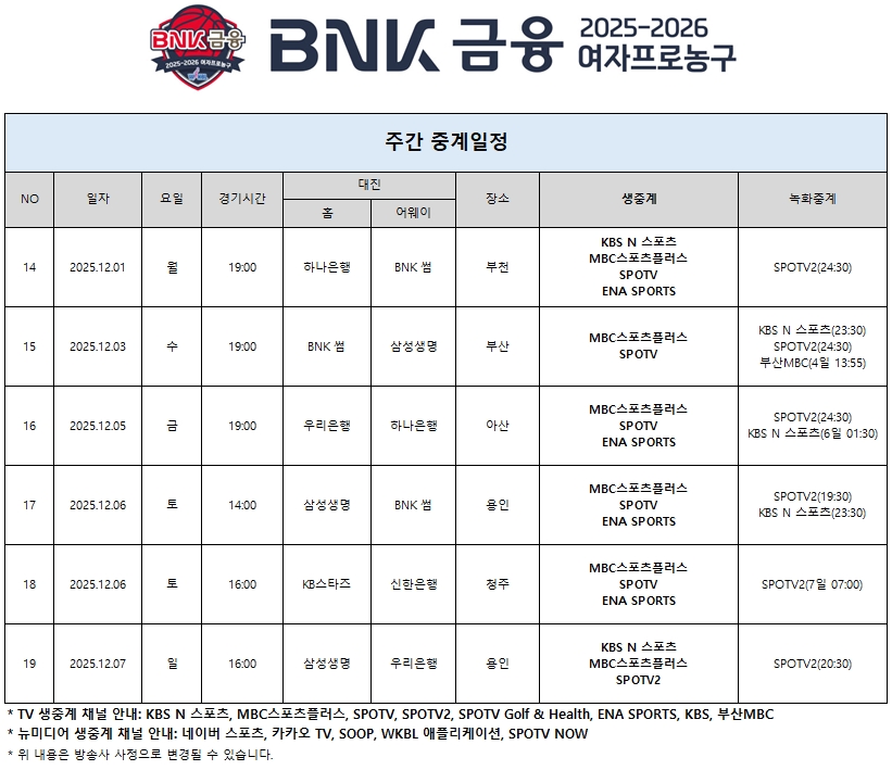 2025년 12월 첫째주 중계일정