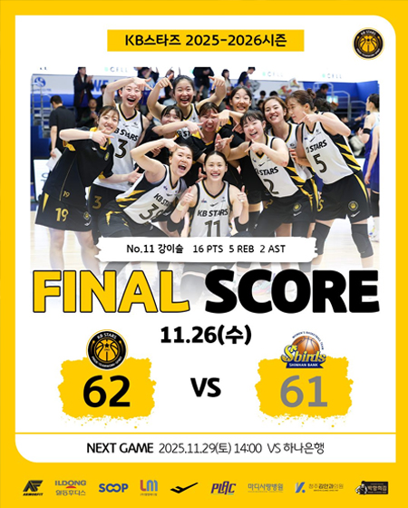 #KB스타즈 11월 26일 [경기 결과] 작성일: 2025-11-26 조회: 35 페이스북 공유 트위터 공유 카카오스토리 공유 KB스타즈 | 11월 26일 [경기 결과]KB스타즈 62-61 신한은행#KB스타즈 ㅣ #정규리그 ㅣ #GAMEDAY#2025_2026시즌 #1라운드 #GAME3 #경기결과#원정경기 #승리 #3승#플랙 #프로스펙스 #SOOP#엘앰메디컬 #청주김안과의원#마디사랑병원 #일동후디스#박향희김 #아머핏 [자세히보기]