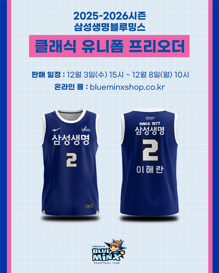 #삼성생명 두둥~ 클래식 유니폼 & 키링 프리오더 안내 작성일: 2025-12-01 조회: 91 페이스북 공유 트위터 공유 카카오스토리 공유 두둥~ 클래식 유니폼 & 키링 프리오더 안내 2025년 12월 3일 (수) 15시 ~ 12월 8일 (월) 10시삼성생명블루밍스 온라인 몰선수단은 12월 15일 vs KB스타즈전(원정)그리고 1월 11일 vs KB스타즈전(홈)에 클래식 유니폼 착용합니다 #클래식유니폼 #클래식유니폼판매 #유니폼프리오더 #블밍티비 #블밍캠 #삼성생명 #삼성생명블루밍스 #프로스펙스 #GOBLUEMINX #WKBL #여자농구?? [자세히보기]