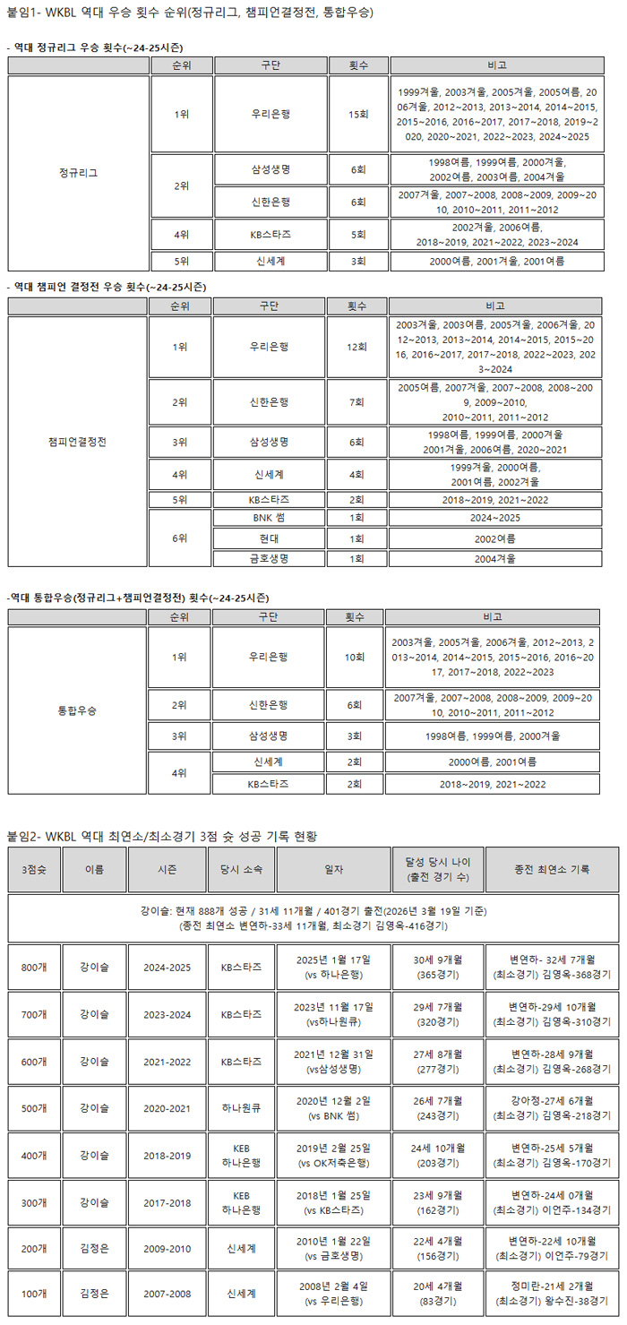 한편, 역대 여자농구 월드컵 예선 한 경기 최다 3점슛 신기록(8개)을 세우며 맹활약한 KB스타즈 강이슬은 의미 있는 기록에 도전한다. 남은 3경기에서 3점슛 12개를 성공시키면 역대 최연소이자 최소 경기 900개 성공이라는 대기록을 달성하게 된다. 올 시즌을 끝으로 은퇴를 선언한 하나은행 김정은은 남은 4경기에서 39점을 추가하게되면 통산 8,500득점 고지를 넘어서며 본인의 최다 득점 1위 기록을 더 늘리게 된다.