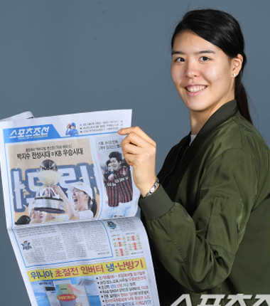 ""이렇게 보니 기분이 이상한데요."" ''막내 에이스'' 박지수(21·청주 KB스타즈)가 자신의 정규리그, 챔피언결정전 우승 장면을 보며 빙그레 웃는다. 코트를 벗어난 에이스는 ''스물 한 살'' 앳된 얼굴이었다. 봄바람이 살랑 불어오던 지난 3월. 박지수는 한국여자프로농구(WKBL)의 역사를 새롭게 썼다. 그는 정규리그 35경기에서 평균 13.06점-11.1리바운드를 기록하며 팀을 정상으로 이끌었다. 챔피언결정전 3경기에서는 평균 25점-12리바운드를 잡아내며 KB스타즈의 창단 첫 통합우승에 앞장섰다. 정규리그와 챔피언결정전 통합 MVP는 그의 몫이었다. 이견은 없었다. 만장일치. 무엇보다 그는 ''최연소'' 기록을 싹 갈아치우며 역사의 한 장을 썼다. 하지만 여전히 우승이 믿기지 않는 듯 ''얼떨떨''한