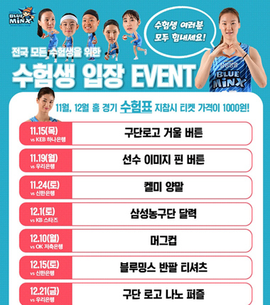 삼성생명도 수험생들을 위해 다채로운 이벤트를 마련했다.용인 삼성생명이 11월, 12월 홈경기에 대학수학능력시험 수험생을 대상으로 이벤트 경품을 준비했다.
