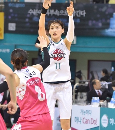 강이슬이 한 시즌 3점슛 100개를 돌파했다. 부천 KEB하나은행은 7일 부천체육관에서 열린 2017-18 신한은행 여자프로농구 정규 시즌 홈경기에서 구리 KDB생명을 84-61로 이겼다. 시즌 마지막 경기를 승리로 장식한 KEB하나은행은 12승 23패, 최종 순위 5위로 다음 시즌을 기약했다.