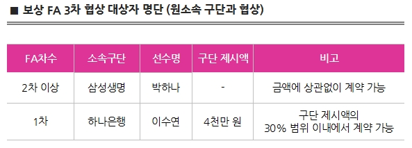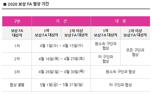 2020년도 보상 FA(자유계약선수) 작성일 2020-04-06 조회 10136 공유하기 페이스북 공유 트위터 공유 카카오스토리 공유 <2020년 1차 협상 결과 (20.04.15)><2020년 2차 협상 결과 (20.04.25)><2020년 3차 협상 결과 (20.04.30)>