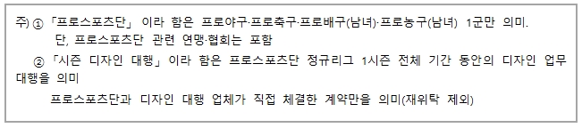 - 공고일 기준 최근 3년 이내 대한민국 內 프로스포츠단 시즌 디자인 대행 업무 경험 보유 업체주)
