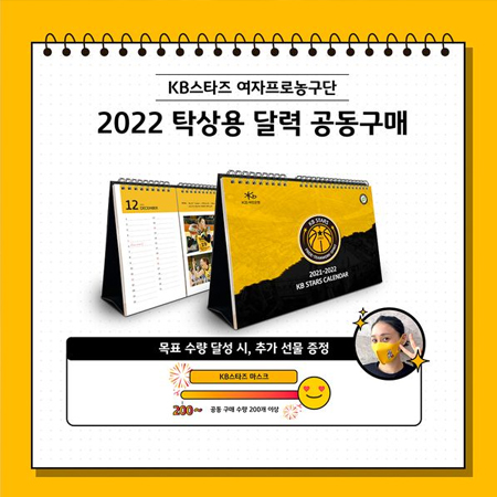 #KB스타즈'2022년 선수단 달력' 주문 마감 2일 남았습니다!^^ 작성일 2021-11-22 조회 5549 공유하기 페이스북 공유 트위터 공유 카카오스토리 공유 KB스타즈 「2022년 선수단 달력」 공동구매 '2022년 선수단 달력' 주문 마감 2일 남았습니다!^^【선수단 달력 주문서 작성하기】forms.gle/4BRAWS36tpDuAxb5A 2022년 KB스타즈 선수단 탁상용 달력 공동구매 판매 기간 : 2021년 11월 16일(화) ~ 11월 23일(화) 주문 방법 : 구글폼 주문서 작성 및 입금 판매 금액 : 13,000원 (1인당 최대 5개 구매 가능) 목표 수량 달성 시 '마스크' 추가 선물 증정 수령 방법 : 배송 or 현장 수령 [택 1] 안내 사항 현장 수령 방법 : 11월 26일(금)부터 홈 경기일 '스타즈 스토어'에서 수령 가능 택배 발송 예정일 : 11월 29일(월) 수량별 판매 금액 안내개 - 13,000원 개 - 23,000원 개 - 33,000원 개 - 43,000원 개 - 53,000원공동 구매 이후 구입 안내공동 구매 기간 이후 홈 경기일 청주체육관 '스타즈 스토어'에서 15,000원 현장 판매#KB스타즈 #선수단달력 #공동구매 #마감2일전#2022년 #2022년달력 #KB스타즈달력#구글폼 #주문 #탁상용달력#목표수량달성시 #마스크 #추가증정#아프리카TV #관절지킴이 #하이드로플라스크 #마디사랑병원#여자프로농구 #여자농구 #WKBL #여농#국민농구방송 #아프리카TV편파중계#청주KB스타즈 #V2#JUST_ONE_SPIRIT [자세히보기]