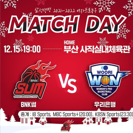 #BNK 썸12월 15일(수) 경기 일정 안내 작성일 2021-12-15 조회 5289 공유하기 페이스북 공유 트위터 공유 카카오스토리 공유 🔔 경기 일정 안내🗓 12월 15일(수) 19:00🆚 아산 우리은행 / 사직실내체육관🖥 IB Sports, KBSN Sports, MBC sports+2021년 마지막 홈 경기사직에서 만나요😆#부산 #BNK썸 #경기일정 #여자농구 #WKBL #썸티비 #홈경기 #사직실내체육관 [자세히보기]