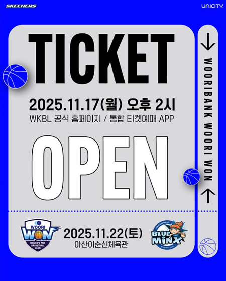#우리은행TICKET OPEN! 작성일 2025-11-16 조회 72 공유하기 페이스북 공유 트위터 공유 카카오스토리 공유 TICKET OPEN!우리은행 홈 개막전 vs 삼성생명25.11.22(토) 14:00아산이순신체육관예매 오픈 : 11.17(월) 14시WKBL 공식 홈페이지 / 통합 티켓예매 APP#우리은행우리WON #WKBL #여자프로농구#홈경기 #티켓예매 #TICKETOPEN#UNICITY #스케쳐스 [자세히보기]