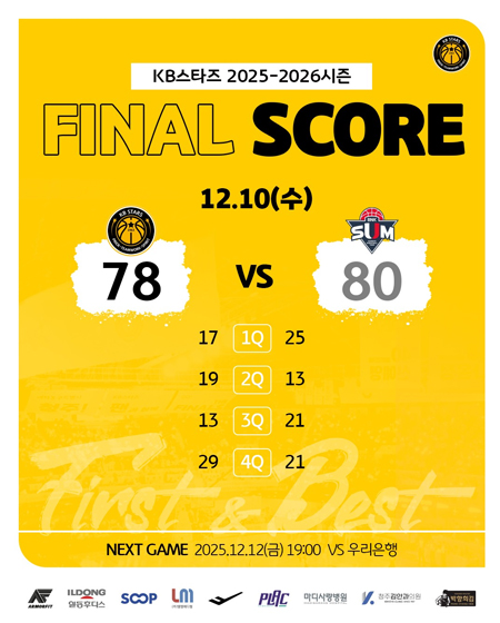 #KB스타즈12월 10일 [경기 결과] 작성일 2025-12-11 조회 39 공유하기 페이스북 공유 트위터 공유 카카오스토리 공유 KB스타즈 | 12월 10일 [경기 결과]KB스타즈 78-80 BNK 썸#KB스타즈 ㅣ #정규리그 ㅣ #GAMEDAY#2025_2026시즌 #2라운드 #GAME2 #경기결과#원정경기 #4승3패#플랙 #프로스펙스 #SOOP#엘앰메디컬 #청주김안과의원#마디사랑병원 #일동후디스#박향희김 #아머핏#청주KB스타즈 #KB스타즈농구단#KBSTARS #KBスタ?ズ #First_and_Best#WKBL #여자농구 #여농#유튜브채널 #국민농구방송 [자세히보기]