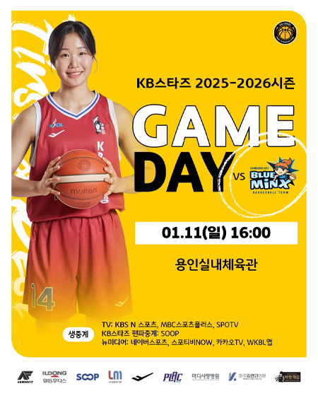 #KB스타즈GAME DAY 작성일 2026-01-11 조회 62 공유하기 페이스북 공유 트위터 공유 카카오스토리 공유 KB스타즈 | GAME DAY2026년 1월 11일(일) 16:00KB스타즈 vs 삼성생명경기 장소: 용인실내체육관KB스타즈 편파중계: SOOPTV 생중계: KBS N 스포츠, MBC스포츠플러스, SPOTV뉴미디어 생중계: 네이버스포츠, 스포티비NOW, 카카오TV, WKBL앱#KB스타즈 ㅣ #정규리그 ㅣ #GAMEDAY#2025_2026시즌 #3라운드 #GAME4#원정경기 #KB스타즈편파중계 #SOOP#KBSN스포츠 #MBC스포츠플러스 #SPOTV#플랙 #프로스펙스#엘앰메디컬 #청주김안과의원#마디사랑병원 #일동후디스#박향희김 #아머핏 [자세히보기]