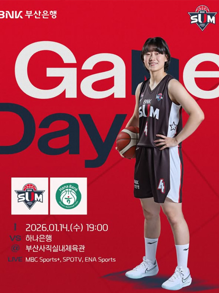 #BNK 썸GAME DAY 작성일 2026-01-14 조회 21 공유하기 페이스북 공유 트위터 공유 카카오스토리 공유 2025-2026시즌 BNK 썸GAME DAY일시 : 2026년 1월 14일(수) 19:00장소 : 부산사직실내체육관VS 하나은행중계 : MBC Sports+, SPOTV, ENA Sports#BNK썸 #BNK썸여자프로농구단 #BNK부산은행 [자세히보기]