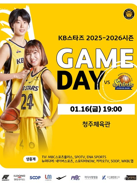 #KB스타즈GAME DAY 작성일 2026-01-16 조회 36 공유하기 페이스북 공유 트위터 공유 카카오스토리 공유 KB스타즈 GAME DAY2026년 1월 16일(금) 19:00KB스타즈 vs 신한은행경기 장소: 청주체육관TV 생중계: MBC스포츠플러스, SPOTV, ENA SPORTS뉴미디어 생중계: 네이버스포츠, 스포티비NOW, 카카오TV, SOOP, WKBL앱 [자세히보기]